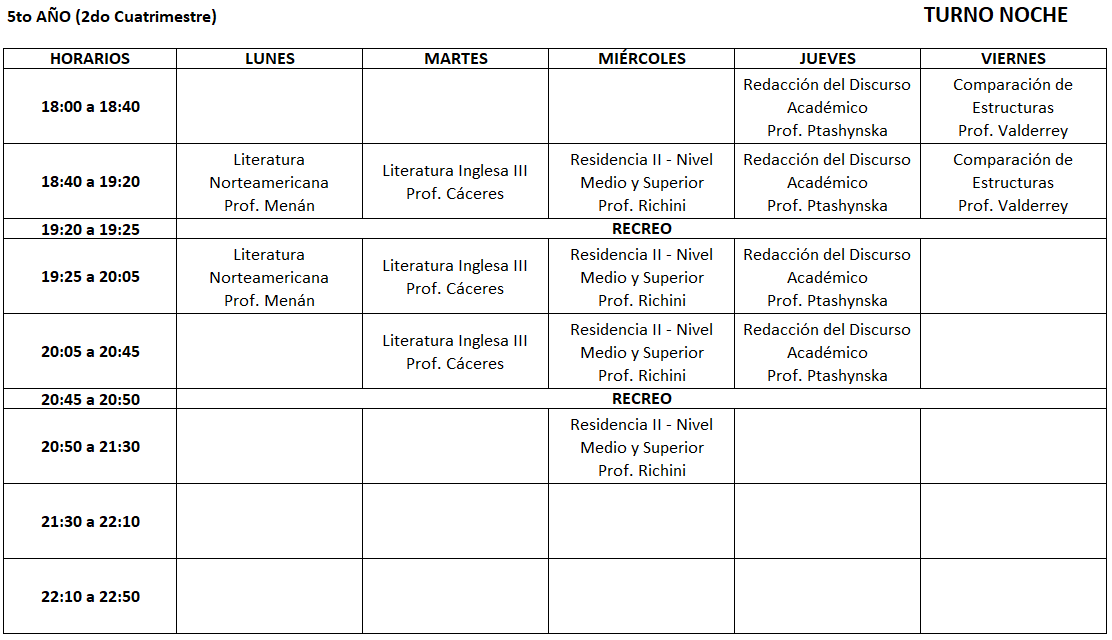 Horarios 2° cuatrimestre 2025 -TN Profesorado